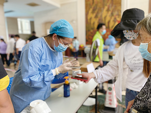 支部書記王文魁在協(xié)助指引人們打疫苗