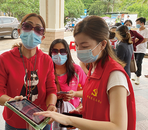 在此次全員檢測中,塘廈三正半山溫泉酒店黨支部積極發(fā)揮作用,支部書記王文魁深夜接到消息后,立即與支部組織委員溫生利、酒店員工關(guān)系經(jīng)理吳伊玥等共同商討,積極號召黨員同志與員工志愿者全力支援核酸檢測工作,隨后一支由黨員和員工志愿者組成的支援隊伍很快形成。6月21日,在核酸檢測現(xiàn)場,溫生利、黃澤敏、張來德等黨員同志和酒店員工志愿者在現(xiàn)場積極開展工作,有的手舉溫馨提示牌,有的維持現(xiàn)場秩序,有的引導排隊,有的講解檢測流程……盡管天氣炎熱,汗流浹背,但他們毫不在意,充分發(fā)揮了黨員先鋒模范作用,讓黨旗高高飄揚在疫情防控一線。