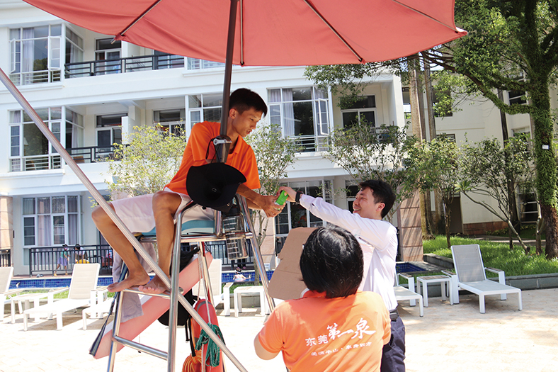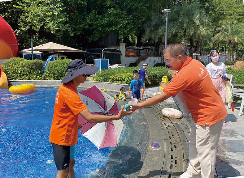 此外,樟木頭三正半山酒店、橋頭三正半山酒店也特別關(guān)注泳池邊保障客人安全的救生員們,在酒店大堂前及停車(chē)場(chǎng)區(qū)域有條不紊地指揮來(lái)往車(chē)輛、維持酒店治安和秩序的保安員們,以及高溫廚房環(huán)境的廚師們等。為了向他們表達(dá)敬意與關(guān)懷,酒店也適時(shí)地為他們準(zhǔn)備了清涼的飲料,保障他們?cè)诰o張忙碌的工作中也能保持良好的身體狀態(tài)。