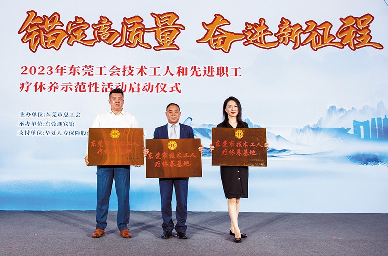 9.6月14日上午,東莞市總工會在東莞迎賓館舉行了2023年東莞工會技術工人和先進職工療休養活動啟動儀式。活動中,市人大常委會副主任、市總工會主席羅軍文為入選“東莞市技術工人療休養基地”的12家單位頒發了牌匾。我集團旗下三家酒店均榮譽入選“東莞市技術工人療休養基地”,橋頭三正半山酒店總經理李啟清、樟木頭三正半山酒店總經理施文靜、塘廈三正半山溫泉酒店副總經理潘林等出席,并分別代表各自酒店上臺接受了牌匾。