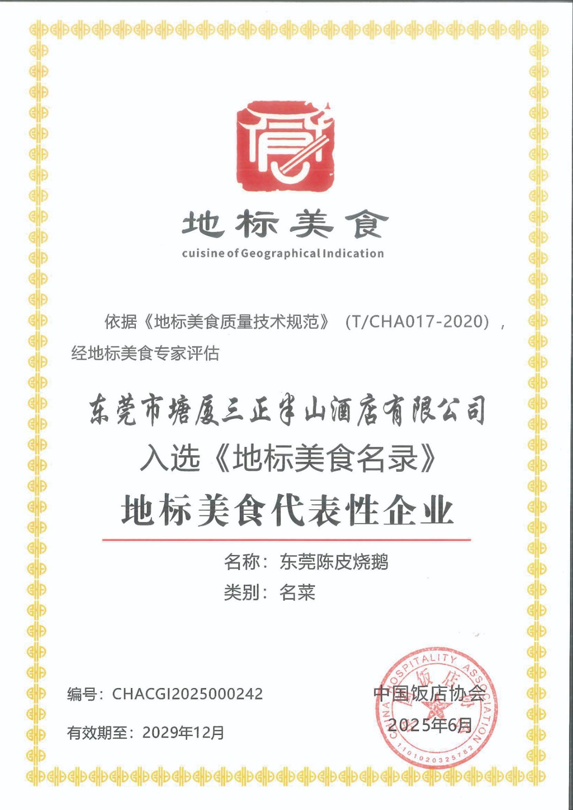 5.6月份,在中國飯店協會主辦的中國地標美食評審中,塘廈三正半山溫泉酒店憑借漢宮中餐廳招牌菜“東莞陳皮燒鵝”成功入選《地標美食名錄》,榮獲“地標美食名菜”稱號,酒店餐飲部副總監兼出品部總監藍武強被認定為該菜品傳承人。同時,酒店被授予“地標美食代表性企業”榮譽。
