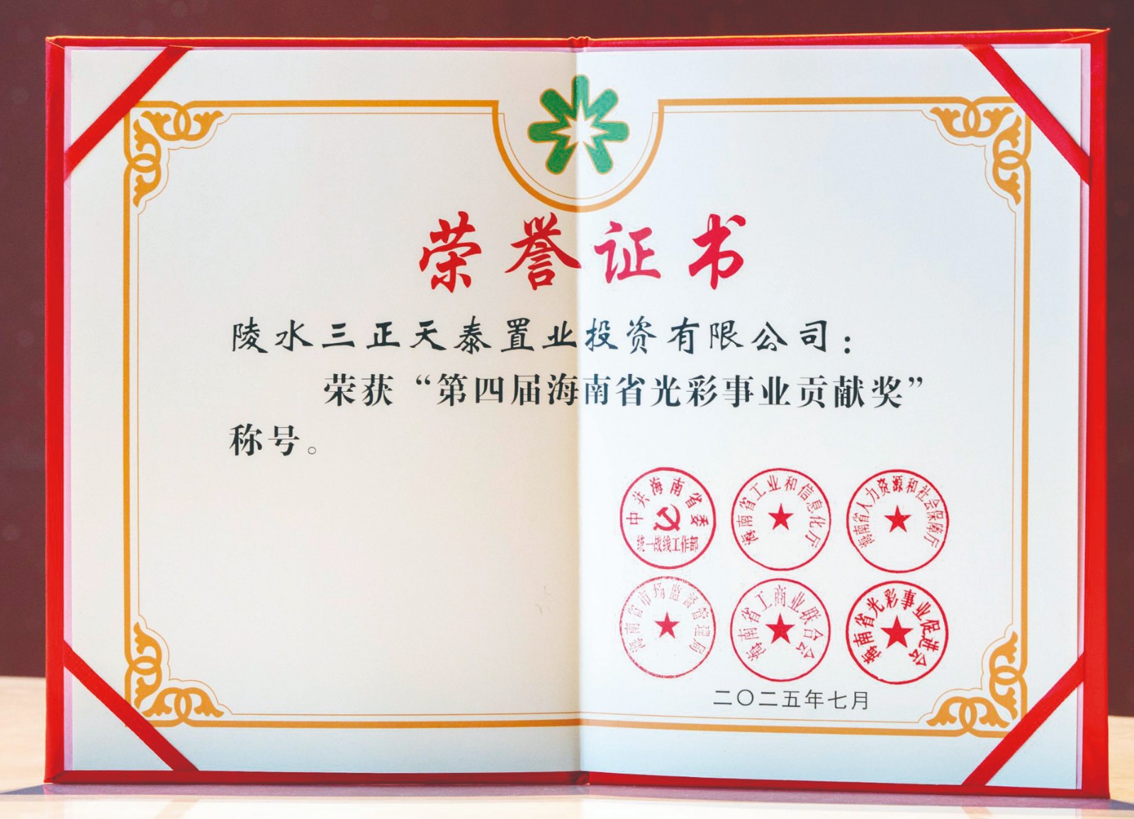 4.7月17日,第四屆海南省非公有制經濟人士優秀中國特色社會主義事業建設者暨光彩事業貢獻獎表彰大會隆重舉行。陵水三正天泰置業投資有限公司憑借在光彩事業領域的突出貢獻與持續踐行社會責任的顯著成果,榮獲“第四屆海南省光彩事業貢獻獎”。